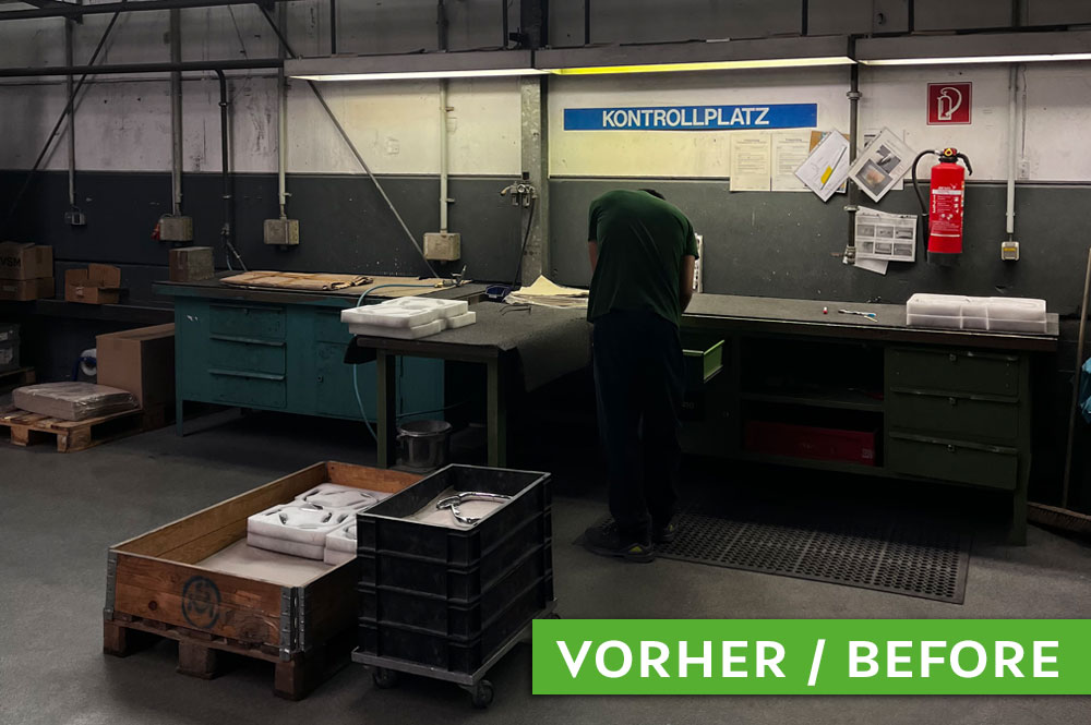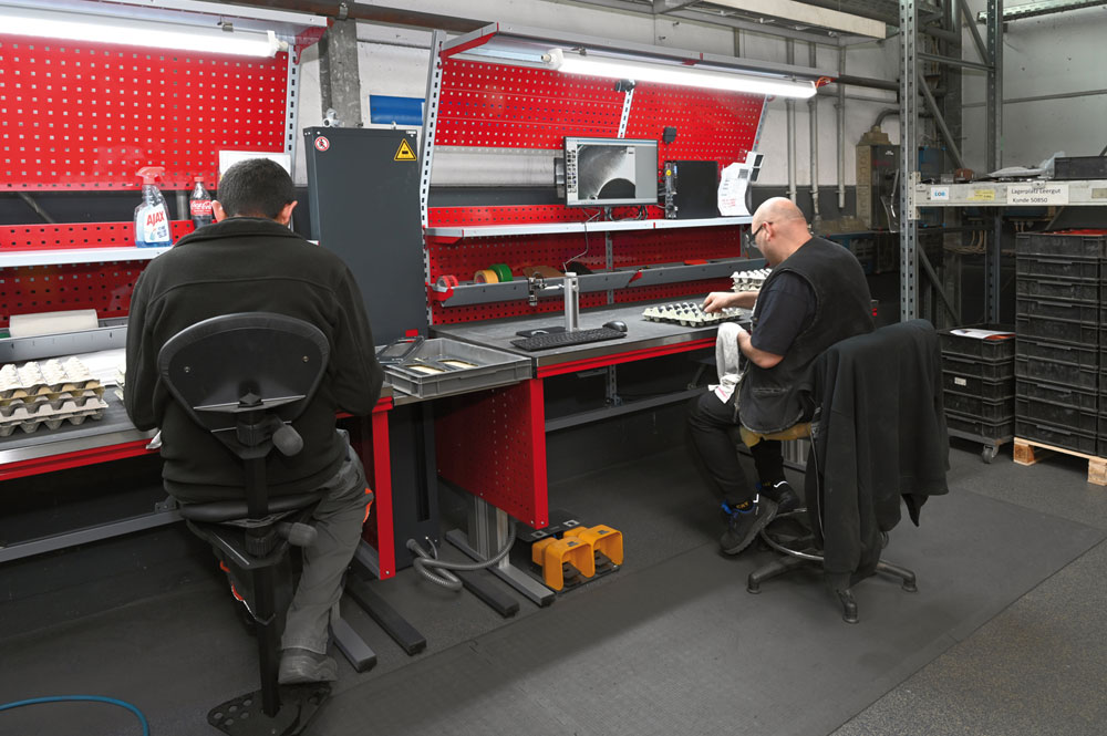 After quality control, the items are packed at the neighbouring table. Where previously an additional workbench positioned across the space stood between the two work areas and separated them, a pneumatic lift now enables a smooth, ergonomic transition.