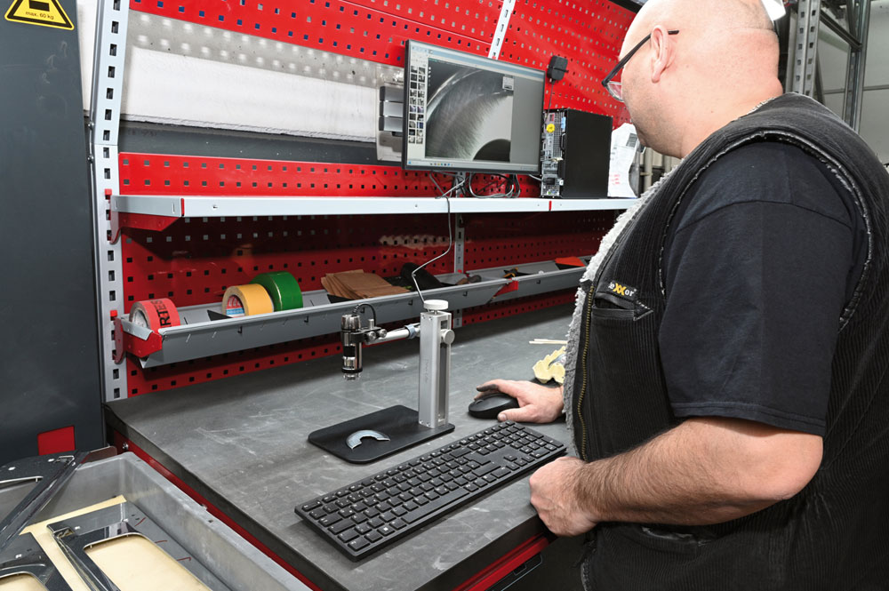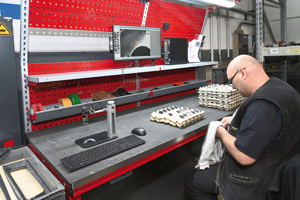 Quality control takes place at the SYSTEM FLEX table on the right. At Nurhak, no item leaves the premises unless it has been inspected by a trained eye and found to be flawless. To assist this trained eye and at the same time reduce the strain on the employee, a monitor with a data link to a magnifying glass has been integrated. This allows the employee to inspect the finished metal products without having to hold them up for long periods.